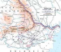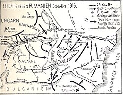 Rumänien trat Ende August 1916 (Offizielles Bündnis mit der Entente 17. August 1916; Kriegseintritt 27. August 1916[1]) während der russischen Brussilow-Offensive auf Seiten der Entente gegen die Mittelmächte in den Ersten Weltkrieg ein. Das Kriegsziel, die Besetzung Siebenbürgens, konnte von den Mittelmächten aber verhindert werden, dagegen ging bis zum Jahresende 1916 die Walachei mit der Hauptstadt Bukarest verloren und die Rumänen wurden bis zum Jahresende auf die Grenze der Moldau zurückgedrängt. Bis zum Sommer 1917 konnte sich die rumänische Armee im Raum östlich Focșani reorganisieren und bewies im Verband der russischen Heeresgruppe Schtscherbatschow große Widerstandskraft. Im Dezember 1917 wurde Rumänien nach dem Ausscheiden des Verbündeten Russland zum Waffenstillstand und im Mai 1918 zum Frieden gezwungen. Als sich die Niederlage des Deutschen Reiches an den anderen Fronten abzeichnete, erfolgte im November 1918 der neuerliche Kriegseintritt Rumäniens. Im Frieden von Trianon konnte sich Rumänien schließlich die erstrebten Gebiete in Siebenbürgen sichern.