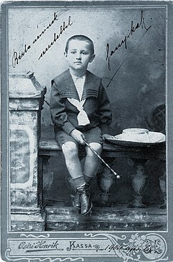 | Der ungarische Schriftsteller Sándor Márai im Alter von 4 Jahren | Ernő Zeltner: Sándor Márai - EinLeben in Bildern, Seite 20, Piper Verlag, München 2001, ISBN 3-492-04350-X | Henrik Cséri | Datei:Sándor márai kind.JPG | |