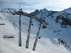 | Blick vom Panoramarestaurant Kanzelwand (1957 m) im Skigebiet Fellhorn/Kanzelwand über die Stützen des Zwerenalpe-Sessellifts auf die Hammerspitzen : Links Hauptgipfel (2260 m) und rechts der Nordwestgipfel (2251 m). | Eigenes Werk | Kauk0r | Datei:Sessellift Zwerenalpe Hammerspitzen.JPG |