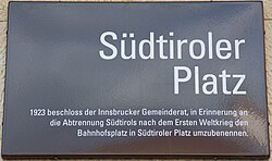 | Südtiroler Platz in Innsbruck , commemorating the separation of the County of Tyrol after World War I | Eigenes Werk | Noclador | Datei:Südtiroler Platz - Innsbruck.jpg |