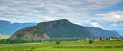 | Blick auf das Unterland von der Rotwand in südliche Richtung, die Salurner Klause etwas im Hintergrund, in der Bildmitte Neumarkt, Auer und dazwischen der Hügel von Castelfeder. Die Etsch und die kleine Brücke des Etschtalradwegs über den Branzoller Graben nahe am Fluss und der Eisenbahnlinie sind beim hineinzoomen zu erkennen. | Eigenes Werk | Plentn | Datei:Unterland Salurner Klause.JPG | |