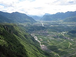 | In the Italian wine region of Trentino-Alto Adige/Südtirol | Flickr : Up valley and apples. | Jon Shave | Datei:Up valley and apples in Valdadige Towards BolzanoBozen.jpg |