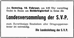 | Public invitation to the SVP Party Landesversammlung 1952 at the Reichrieglerhof Bozen | Dolomiten newspaper from 1952, all images freely licensed under CC 4.0 on digital.tessmann.it, 70 years and older | Autor/-in unbekannt Unknown author | Datei:DOL 1952 02 09 10 Landesverslg SVP Reichrieglerhof.png | |