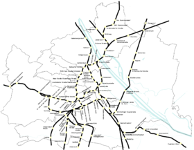 | Die Karte zeigt schematisch die Linienführung der S-Bahn sowie des Regional- und Fernverkehrs innerhalb Wiens sowie die zugehörigen Haltepunkte. S-Bahn (S1, S2, S3, S4, S7, S40, S50, S60, S80) S-Bahn ( Stammstrecke aus S1, S2, S3, S4, S7) S-Bahn ( S45 ) Regionalzüge ( R , REX , CJX ) Fernzüge ( D , IC , EC , RJ , RJX , ICE , NJ , EN ) City Airport Train (CAT) | Eigenes Werk | Domser | Datei:Bahnsystem in Wien.png |