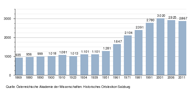 Die wirtschaftliche Entwicklung ist auch an der Entwicklung der Einwohnerzahlen abzulesen. Während von der Volkszählung 1869 bis 1900 die Bevölkerung nur verhältnismäßig geringfügig von 935 auf 1018 anstieg, brachten die nächsten zehn Jahre einen Zuwachs um 6,2 %, dem bis 1923 wieder ein Rückgang um −6,2 % folgte. Danach nahm die Bevölkerungszahl bis 1934 erneut um 8,7 % zu, stagnierte bis 1939 und wuchs seit damals kontinuierlich an (mit Zuwächsen von mehr als 25 % in den 1950er und 1960er Jahren). Auch zwischen der vorletzten Volkszählung 1991 und der letzten im Jahr 2001 gab es neuerlich einen Zuwachs um 8,6 %. Dieser ist der positiven Geburtenbilanz (+300) zu verdanken, durch die die negative Wanderungsbilanz (−60) wettgemacht wurde.