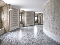 - ↑ Eine Aufteilung nach namentlich Bekannten und Unbekannten sowie nach Zugehörigkeit findet sich auf zwei Tafeln links und rechts des Eingangs zum Rundbau.