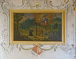 | Wandbild Gründungsgeschichte 1255 soll dem Leutpriester Dietrich von Rickenbach die Gottesmuter erschien sein und wurde von ihr beauftragt, die mit einem Kreuz bezeichnete Tanne zu fällen und dort eine Kapelle zu errichten, dann werde der Fluch von dieser Gegend nenommen. Daher auch Todt-Moss, ein "grausam pestilenzischer Sumpf". | Eigenes Werk | PantaRhei | Datei:Todtmoos Wallfahrtskirche - Wandbild Gründungsgeschichte.jpg |
