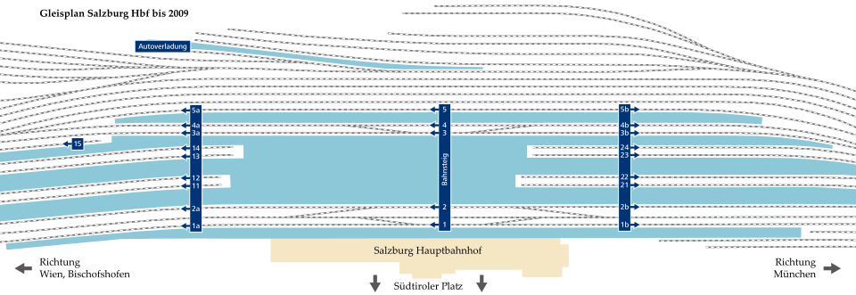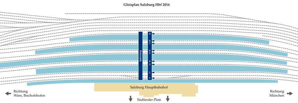 | Hauptbahnhof Salzburg, Mittelbahnsteig | Eigenes Werk | Arne Müseler / www.arne-mueseler.de | Datei:Hauptbahnhof Salzburg 5a.jpg | |