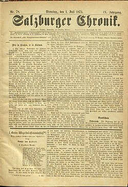 Die Salzburger Chronik war eine österreichische, katholisch ausgerichtete Zeitung, die zwischen 1865 und 1938 in Salzburg erschien. Von 1865 bis 1873 hieß sie Salzburger Chronik für Stadt und Land, ihre Fortsetzung war ab 1938 die Salzburger Zeitung.[1] Sie erschien zunächst nur wöchentlich, ab 1867 wurden drei Ausgaben pro Woche gedruckt. Um der Konkurrenz gewachsen zu sein, stellte man ab 1882 auf werktägliches Erscheinen um und gab gleichzeitig ein Wochenblatt heraus.