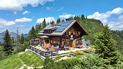 | Südostansicht der Goiserer Hütte in der oberösterreichischen Gemeinde Bad Goisern. Die Hütte befindet sich auf dem Sattel zwischen dem Sonnwendkogel (1638 m) und dem Hohen Kalmberg (1833 m) auf 1592 Meter Höhe und unmittelbar zur Gemeindegrenze von Gosau. Errichtet wurde sie von der Sektion Bad Goisern des Österreichischen Alpenvereins und am 10. September 1933 eröffnet. 1976 wurde eine rd. 1500 Meter lange Materialseilbahn hinauf zur Goiserer Hütte errichtet. Im Jahr 2013 erfolgte um fast 700.000 Euro eine Sanierung und Erweiterung der Hütte statt. Dabei wurde die halbe Hütte abgetragen und ein Neubau vorgenommen, wobei ihr Charakter erhalten blieb (man verzichtete auf eine neumoderne Architektur): 1 . | Eigenes Werk | C.Stadler/Bwag | Datei:Bad Goisern - Goisererhütte.JPG | |