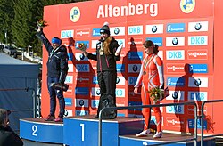 | Siegerehrung zum Weltcuprennen der Frauen beim Rennrodel-Weltcup 2018/19 in Altenberg | Selbst fotografiert | Sandro Halank , Wikimedia Commons | Datei:2019-02-03 Women's World Cup Victory Ceremony at 2018-19 Luge World Cup in Altenberg by Sandro Halank–035.jpg | |