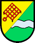- „In einem von Gold und Grün schräglings geteilten Schild ein gleich gestellter roter Feuerrost mit Stiel und Ring im oberen, ein waagrechter silberner Wellenbalken in der Mitte des unteren Feldes“.