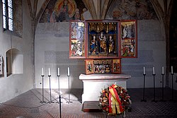 | Der spätgotische Flügelaltar von Sankt Magdalena im Halltal, seit 1923 befindet er sich in der Kriegergedächtniskapelle in Hall in Tirol | Eigenes Werk | Haneburger | Datei:Kriegergedaechtniskapelle Hall.JPG | |