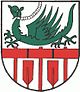 - „In einem silbernen Schild wachsend pfahlweise zwei rote Ruder im Schildfuß zwischen drei roten langgestielten Hämmern; die aneinanderstoßenden Hämmer selbst reichen bis zur Schildmitte und bilden einen Balken, über dem ein herschauender grüner Drache durch ein schwarzes Halsband und eine schwarze Kette in der Mitte des oberen Schildrandes angekettet ist.“