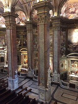 Das 1521/22 für die Fuggerkapelle geschaffene Altarbild von Giulio Romano ziert seit 1750 den Hauptaltar der Kirche. Mit Bezug auf die Stifter zeigt es die Heiligen Jakobus und Markus in Anbetung der Heiligen Familie. Die figurenreichen Fresken der Fuggerkapelle mit dem Leben Mariens schuf um 1550 Girolamo Siciolante da Sermoneta im Stil des Manierismus. Die Fresken der benachbarten Annenkapelle malte Giovanni Francesco Grimaldi, das zugehörige Altarbild der Anna selbdritt Giacinto Gemigniani. Die vor 1618 entstandenen Altarbilder der Benno- und der Lambertuskapelle, das Fischwunder bzw. das Martyrium darstellend, stammen von Carlo Saraceni, die barocken Fresken der Lambertuskapelle, das Leben des Heiligen und seine Apotheose darstellend, wurden um 1650 durch Jan Miel ausgeführt. Das Altarbild der Kreuzabnahme in der Markgrafenkapelle, auf dem sich Albrecht IV. porträtieren ließ, wurde von Francesco Salviati geschaffen, der auch die fast expressionistisch wirkenden Fresken dieser Kapelle mit Auferstehung und Pfingstwunder schuf. Das Altarbild der Dreifaltigkeit in der Barbarakapelle mit dem Stifterportrait des Kardinals Enckenvoirt stammt zusammen mit der Freskenausstattung der Kapelle von Michiel Coxcie aus Mecheln. Die von Papst Pius IX. gestiftete Ausmalung und das 1906 datierte Altarbild der Johannes-Nepomuk-Kapelle von Ludwig Seitz zeigen neben dem Titelheiligen den von Pius IX. seliggesprochenen Jan Sarkander. Das von Giovanni Francesco Romanelli um 1640 geschaffene Deckenfresko in der barocken Sakristei zeigt die Aufnahme Mariens in den Himmel.