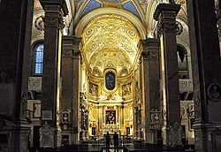Im Kircheninneren werden die mit Rippen versehenen Gewölbe von Pfeilern mit schiffsseitig vorgelegten korinthischen Pilastern getragen. Zwischen den seitlichen Strebepfeilern sind raumhohe, zum Schiff halbrund geöffnete Seitenkapellen eingefügt, darin dem Bautypus der spätgotischen Wandpfeilerkirche verwandt.[25] Obgleich der Gemeinderaum über einem fast quadratischen Grundriss erbaut ist, herrscht durch die Anordnung von Pfeilern und Gewölben der Eindruck eines gerichteten Raumes vor. Der ursprüngliche Bauplan hatte zudem noch eine Längenerstreckung von fünf statt gegenwärtig vier Jochen, und damit eine deutlichere Längsausrichtung vorgesehen, was jedoch an dem Widerstand der römischen Straßenbauverwaltung scheiterte.[26]