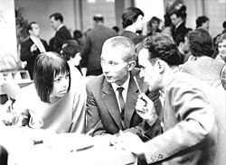 | Es folgt die historische Originalbeschreibung , die das Bundesarchiv aus dokumentarischen Gründen übernommen hat. Diese kann allerdings fehlerhaft, tendenziös, überholt oder politisch extrem sein. Zentralbild-Franke tre-wo. 14.11.1964 Berliner Jugend mit über 30 Schriftstellern beim Literaturfestival. Zum Rendezvous mit über 30 prominenten Schriftstellern saßen am 14.11.1964 bei einem Eisbecher im Cafe "Forum" Berliner Jungen und Mädchen, begierig, etwas über die Arbeit ihrer Idole zu erfahren. So begann das I. Literaturfestival der Berliner Jugend, zu dem FDJ-Bezirksleitung und Schriftstellerverband eingeladen hatten, im Haus des Lehrers am Alexanderplatz. UBz.: Unter den anwesenden Schriftstellern befand sich das Ehepaar Rainer und Sarah Kirsch (Links und in der Mitte sitzend). | Dieses Bild wurde im Rahmen einer Kooperation zwischen dem deutschen Bundesarchiv und Wikimedia Deutschland aus dem deutschen Bundesarchiv für Wikimedia Commons zur Verfügung gestellt. Das deutsche Bundesarchiv gewährleistet eine authentische Bildüberlieferung nur durch die Originale (Negative und/oder Positive), bzw. die Digitalisate der Originale im Rahmen des Digitalen Bildarchivs . | Klaus Franke | Datei:Bundesarchiv Bild 183-C1114-0020-002, Berlin, Literaturfestival, Sarah und Rainer Kirsch.jpg | |