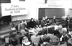 | Es folgt die historische Originalbeschreibung , die das Bundesarchiv aus dokumentarischen Gründen übernommen hat. Diese kann allerdings fehlerhaft, tendenziös, überholt oder politisch extrem sein. ADN-ZB-Kutscher 11.4.75 Berlin: Plädoyer für Poesie war der Titel einer Schriftstellerlesung der Akademie der Künste der DDR am 10.4.75. Aus Anlaß des 25. Jahrestages der Akademie lasen Günther Deicke, Volker Braun, Sarah Kirsch, Wieland Herzfelde, Franz Fühmann und Stephan Hermlin (v.l.n.r.). Die Leitung der Diskussion hatte Günther Rücker (5.v.l.) übernommen. | Dieses Bild wurde im Rahmen einer Kooperation zwischen dem deutschen Bundesarchiv und Wikimedia Deutschland aus dem deutschen Bundesarchiv für Wikimedia Commons zur Verfügung gestellt. Das deutsche Bundesarchiv gewährleistet eine authentische Bildüberlieferung nur durch die Originale (Negative und/oder Positive), bzw. die Digitalisate der Originale im Rahmen des Digitalen Bildarchivs . | Kutscher (verehe. Kubiziel), Sig | Datei:Bundesarchiv Bild 183-P0411-0022, Berlin, Plädoyer für Poesie, Sarah Kirsch.jpg | |