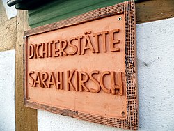 | Fassadenschild am einstigen Pfarrhaus in Limlingerode, heute: Dichterstätte Sarah Kirsch . Foto: Holger Zürch | Eigenes Werk | Holger Zürch | Datei:Fassadenschild Pfarrhaus Limlingerode.JPG | |