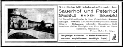 | Baden bei Wien, Sauerhof und Peterhof, 1925 als Mittelstandssanatorien beworben | Badener Zeitung, 25. Oktober 1925, S. 3 | Earnest B | Datei:Sauerhof-und-Peterhof-1925.gif |