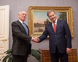 Im Mai 2016 nahm Niinistö auf Einladung des damaligen US-Präsidenten Barack Obama an einem Gipfel der Nordischen Länder in Washington, D.C. teil. Themen waren unter anderem der Klimawandel, der Kampf gegen Terrorismus und die europäische Flüchtlingskrise.[43] Auch unter der Präsidentschaft von Donald Trump bemühte sich Niinistö um enge diplomatische Beziehungen zwischen Finnland und den Vereinigten Staaten, kritisierte aber insbesondere dessen Klimapolitik und die Entscheidung aus dem Pariser Klimaabkommen auszutreten.[36] Im August 2017 kamen Niinistö und Trump erstmals im Weißen Haus zu einem Treffen zusammen. Bei der anschließenden Pressekonferenz verwechselte Präsident Trump zwei finnische Journalistinnen miteinander. Das Verhalten Trumps wurde von der Presse als frauenfeindlich eingestuft und scharf kritisiert. Niinistö reagierte daraufhin fassungslos und erklärte Trump, dass es sich um zwei verschiedene Journalistinnen handele. Für seine Reaktion wurde er überwiegend gelobt.[44][45] Am 2. Oktober 2019 besuchte Niinistö Trump erneut im Weißen Haus.