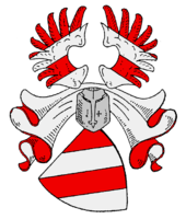 Gelegentlich kommen auch drei rote Schrägrechtsbalken vor,[11] besonders bei Allianzwappen, wo die Wappensymbole traditionell „einander zugewandt“ dargestellt wurden. Mittelalterliche Wappenabbildungen zeigen also teilweise drei rote Schrägbalken.[12][13]