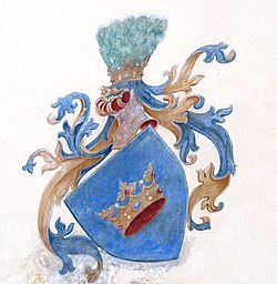 Blasonierung: Das Wappen zeigt in Blau eine gelbe Laubkrone, offen inwendig r.-gefüttert begleitet mit einem großen emporgerichteten dreilappigen Blatt in der Mitte und mit auf den beiden Seiten zwei kleineren Blättern, zwischen welchen sich zwei Spitzen mit Perlen befinden. Der Helm mit blau-gelben Decke trägt die Krone und an jedem der Blätter ist durch eine große Kugel ein Pfauenwedel (3,2,1 Feder) befestigt.[2]