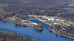 Luftaufnahme der Schiffswerft Korneuburg | Diese Datei ist ein Ausschnitt aus einer anderen Datei | Fotografie: flightlog / Bearbeitung (Ausschnitt erstellt, Dunst entfernt): Christoph Waghubinger ( Lewenstein ) | Datei:Schiffswerft Korneuburg Luftbild.jpg | |