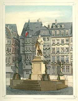 | Gipsmodell des Schillerdenkmals, zur Schillerfeier in Frankfurt a.M. aufgestellt auf dem Römerberg 1859 | Gedenk-Buch zu Friedrich von Schiller’s hundertjähriger Geburtsfeier, begangen in Frankfurt am Main den 10. November 1859. Frankfurt a.M., Verlag von Heinrich Keller 1860. | Johannes Dielmann (1819-1886). Foto von Ferdinand Karl Klimsch (1812-1890) | Datei:Schiller Denkmal FaM.jpg |
