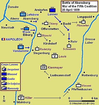 Unter der Bezeichnung Schlacht bei Abensberg werden mehrere Gefechte zusammengefasst, die zwischen dem 19. und 20. April 1809 hauptsächlich zwischen den Flüssen Abens und Große Laaber stattfanden. An diesen Tagen begegneten sich das österreichische Heer unter Erzherzog Karl und die französische Armee unter Kaiser Napoleon mit unterschiedlichen Intentionen auf sehr breiter Front zwischen Mainburg an der Abens im Süden und Peising bei Bad Abbach im Norden. Dabei kam es zu größeren Gefechten bei Offenstetten,[1] Kirchdorf, Siegenburg, Rohr und Rottenburg. In enger Verbindung mit diesen Kämpfen standen die Gefechte bei Pfaffenhofen an der Ilm, Peising (bei Bad Abbach), Langquaid, Thann,[2] Teugn und Hausen (→Schlacht bei Teugn-Hausen).[3]