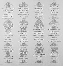 | Namen der Schlachten, die auf den Innenseiten der großen Bögen des Arc de Triomphe eingraviert sind | J. D. Thierry: Arc de triomphe de l’Étoile , Paris 1845, pl. 24 Inscriptions sous le grand arc | Jules D. Thierry | Datei:Batailles gravées sous grandes arcades.jpg | |