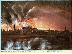 Am 5. Oktober 1794 um 23 Uhr beantworteten französische Kanoniere, die in Gräben des ehemaligen Forts Düsselburg vor Düsseldorf Stellung genommen hatten, eine Kanonade der kaiserlichen Garnison der Stadt mit deren Beschießung, wodurch in der folgenden Nacht ein Großbrand entstand, bei dem das Düsseldorfer Residenzschloss, Kirche und Kloster der Coelestinerinnen in der Ratinger Straße, der kurfürstliche Marstall an der Mühlenstraße sowie viele Bürgerhäuser aus- und abbrannten.
