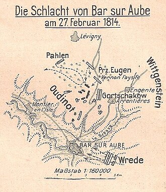 Plan der Schlacht bei Bar-sur-Aube am 27. Februar 1814 | Buch: C. von Zepelin: Die Befreiungskriege 1813 - 1815. Zur hundertjährigen Gedächtnisfeier. Verlag C. A. Weller, Berlin 1913 | In dubio Constantin von Zepelin (1841-1913 | Datei:Battle at Bar-sur Aube on the 27th February 1814.jpg | |