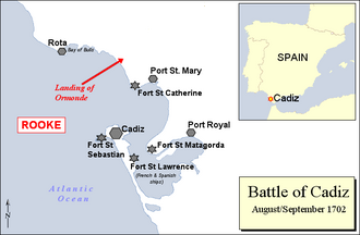 Prinz Georg hatte sich mit seinem Schiff, der Adventure, der Flotte bei Cabo de São Vicente angeschlossen.[9] Sowohl der Prinz als auch Paul Methuen (der sich der Expedition ebenfalls angeschlossen hatte) berichteten Rooke, dass Cádiz nur schwach verteidigt sei, wohingegen des Admirals eigene Erkundigungen, die auf von gefangengenommenen Fischern erlangten Informationen beruhten, auf eine mächtige Garnison von regulären spanischen Truppen, die die Stadt bereits verstärkt hatten, schließen ließen. Alliierte Zweifel über die wahre Stärke der Truppen, die ihnen entgegenstanden, wurden durch die spanische Strategie, auf Erhebungen große Feuer zu entfachen, noch verschlimmert. Daher wurden die drei Tage nach der Ankerung der alliierten Flotte am 23. August vor Cádiz mit nutzlosen Diskussionen verschwendet, bevor irgendeine Entscheidung getroffen wurde.[10]