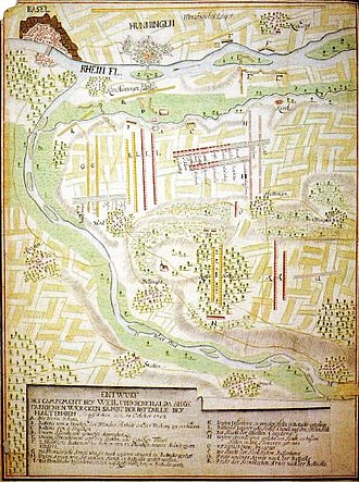 | Map of the Battle of Friedlingen | Original im Generallandesarchiv Karlsruhe; abgedruckt in: Weil am Rhein (Hrsg. Fred Ludwig Sepaintner), 1986, S. 79 | Autor/-in unbekannt Unknown author | Datei:Plan der Schlacht bei Friedlingen.JPG | |