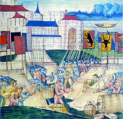 | Die Hinrichtung der bernischen Besatzung von Grandson nach der Einnahme der Stadt durch den burgundischen Herzog Karl den Kühnen am 28. Februar 1476. Darstellung aus der STumpf'schen Chronik | Gemeiner loblicher Eydgnoſchafft Stetten Landen vnd Völckeren Chronik wirdiger thaaten beſchreybung …. 2 Bde. Zürich: Christoph Froschauer 1548. | Johannes Stumpf , upload by | Datei:Belagerung Grandson.jpg | |