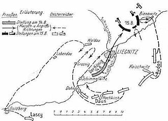 | Karte der Schlacht bei Liegnitz, Stellungen am 10. August 1760 (Preußen schraffiert, Österreich schwarz) | Paul Baerecke: Zum Friedrichstage: die Schlacht von Liegnitz am 15. August 1760. In: Militär-Wochenblatt. Nr. 6, 1906, Digitalisat: Universitätsbibliothek Potsdam https://digital.ub.uni-potsdam.de/content/titleinfo/484636 | Paul Baerecke ( 1866–1915 ) | Datei:Schlacht bei Liegnitz - 1 - Stellungen 10. August 1760.jpg | |