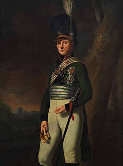 | Anonym (wohl ein bayerischer Hofmaler): Kronprinz Ludwig (der spätere König Ludwig I.) als Oberst des Chevau-légers-Regiment „Kronprinz“; Öl auf Leinwand, 164 x 123 cm. Provenienz: Baron von Eberstein. | http://www.hampel-auctions.com/ | Anonym Unknown author | Datei:Kronprinz Ludwig von Bayern 1807.jpg | |