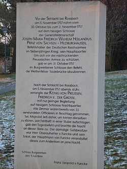 In der Schlacht bei Roßbach in der Nähe von Reichardtswerben im Kurfürstentum Sachsen (heute Sachsen-Anhalt) am 5. November 1757 besiegte der preußische König Friedrich der Große[3] die französische Armee unter dem Fürsten von Soubise (1715–1787) und die mit ihr koalierende Reichsexekutionsarmee unter dem Kommando des Reichsgeneralfeldmarschalls Prinz von Sachsen-Hildburghausen. Die Schlacht markiert einen der Wendepunkte im Siebenjährigen Krieg: Seither beschränkte sich die Konfrontation mit Frankreich auf die westdeutschen Gebiete, erst 50 Jahre später unter Napoleon sollten französische Truppen wieder so weit nach Deutschland vordringen.
