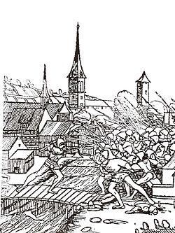 | Die Schlacht bei St. Jakob an der Sihl 1443 während des Alten Zürichkriegs . Holzschnitt aus der Stumpfschen Chronik von 1548 | Gemeiner loblicher Eydgnoschafft Stetten, Landen und Voelckeren Chronick wirdiger thaaten Beschreybung (Stumpfsche Chronik) | Johannes Stumpf (1500-1578), upload by sidonius 08:24, 12 February 2007 (UTC) | Datei:St Jakob a d Sihl.jpg | |