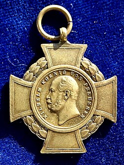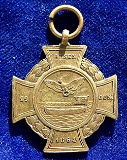 | Prussia, Alsen Cross 1864 VF. Bronze medal, 32 x 32 mm. Wilhelm I, King of Prussia, 1861 - 1888 Head l., around: "WILHELM KOENIG VON PREUSSEN"/ A dingy showing the Prussian War Flag. The Prussian Crowned Eagle flying above. Lettering in the cross: "ALSEN 29 JUN. 1864". v. Heyden 573. The Alsen Cross (German: Alsenkreuz) was a military medal of the Kingdom of Prussia. Established 7 December 1864, the medal commemorates the Prussian victory on 29 June 1864 during the Battle of Alsen. The Battle of Alsen (Danish: Slaget om Als; German: Übergang nach Alsen) was fought on 29 June 1864 during the Second Schleswig War between Denmark and Prussia. It was the last major engagement of the war, as the Prussians under General Herwarth von Bittenfeld secured the island of Als – occupied by 9,000 Danish troops, including the garrison of Dybbøl which had retreated there – in a night attack masterminded by the Chief of Staff (later Field Marshal) Leonhard Graf von Blumenthal. Condition: Nice VERY FINE, with original loop. | Eigenes Werk | Berlin-George | Datei:Alsenkreuz 1864, reverse.jpg | |
