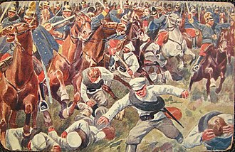 | Front side of Open Letter (Carte Postale) issued in c. 1914 with view of attack of Austro-Hungarian dragoons on Russian infantry at Krasnik (august 1914) | Scanned copy of Carte Postale (Open Letter) of the period | D. K. & Co. P. | Datei:Carte Postale Battle von Krasnik c1914 front.JPG | |