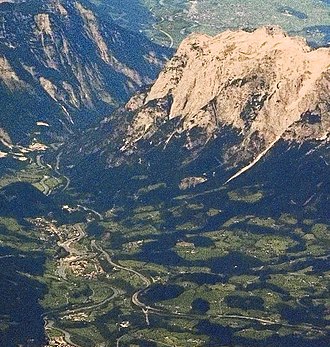 | Mountain range Tennen Mountains (German: Tennengebirge ), seen from South-West. In the center its highest peak Raucheck (2.430 m). Viewpoint Hochkoenig east side. Below the valley of the river Salzach with the small town Werfen. | Eigenes Werk | Stefan Furtner | Datei:Tennengebirge SW.jpg |