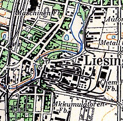 Der südliche Ast der Schleppbahn hatte einen Vorgänger: das Anschlussgleis zum „Industriehorst Liesing“. Dabei handelte es sich um den Versuch, in den Jahren ab ca. 1940 das Industriegebiet um Atzgersdorf und östlich von Liesing um Betriebe für Metall- und Holzverarbeitung zu erweitern.[9][10] Betriebe waren z. B. die Leichtmetallwerke, die Zahnradwerke Hagenmayer,[11] das Carowerk, die Vereinigten Wiener Metallwerke und die Elektron & Co.[12] Diese Betriebe hätten als Zubringerindustrie für die Flugmotorenwerke Ostmark dienen sollen,[13] aber bereits 1942 war man mit Bauten ein Jahr im Rückstand.[12] Auch die Akkumulatorenfabrik, die Akkumulatoren für Elektro(-Untersee-)boote liefern sollte,[14] war ein Teil[15] in diesen Planungen. Diese Pläne hingen u. a. damit zusammen, dass das Gebiet von Wien während des Zweiten Weltkrieges bis 1944 von Bombenflugzeugen nicht erreichbar war, womit auch die Rüstungsbetriebe dieses Gebiets vorläufig noch geschützt waren.[16] Das Gebiet östlich der Brunner Straße[17] wurde dafür mit einem Anschlussgleis Richtung Bahnhof Liesing versehen, wo es im westlichen Teil der Siebenhirtenstraße in das Anschlussgleis der Akkumulatorenfabrik zur Schleppbahn mündete. Die Stadt Wien hatte sich in einem Vertrag verpflichtet, die Aufschließungsarbeiten zu erbringen.[18] Das Gleis zum Industriehorst wurde in den Nachkriegsjahren abgetragen.[11] Der Anschluss der Akkumulatorenfabrik blieb bestehen. Die weiter nach Osten führende Trasse parallel zur Siebenhirtenstraße lag bis in die Mitte der 1960er-Jahre brach, danach wurde auf ihr der südliche Ast der Schleppbahn geführt. Auch die bis dahin jahrelang weitgehend unbenutzten und verwachsenen Verschubgleise parallel zur Südbahn wurden in diesem Zusammenhang erneuert. Als Betreiber dieses Anschlusses und Mitglied des Konsortiums der Betriebe des Industriehorstes bestand die „Liesinger Industriebahn Gen. m. b. H.“, die Liquidation dieser Genossenschaft dauerte bis 1957.[19]