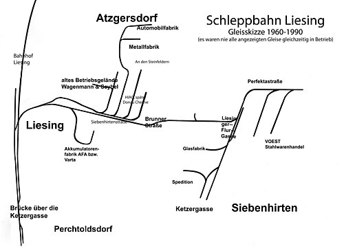 - Der südliche Ast entstand aus dem Gleisanschluss der Akkumulatorenfabrik VARTA an der Siebenhirtenstraße. Dieses Werk war ab 1924 aus der danach stillgelegten Akkumulatorenfabrik in Hirschwang entstanden.[8] Der Gleisanschluss führte über diese Straße mit einer Auflaufkurve in das Gelände der Fabrik. Er wurde Ende der 1960er-Jahre parallel zur Siebenhirtenstraße weiter nach Osten verlängert. Dieser Gleisast querte die Brunner Straße und führte in das Industriegebiet Liesing zur Perfektastraße. Ihm wurden im östlichen Teil des Werkgebietes von Wagenmann & Seybel (im Gebiet des späteren ORF-Zentrallagers und des Senders Liesing) auch Gleise angeschlossen, die bis zu dessen Einstellung über den nördlichen Ast der Gleisanlagen versorgt worden waren.