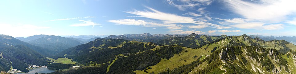 | Panorama der Spitzingseeregion vom Brecherspitz mit dem Spitzingsee (links), Stolzenberg (Bildmitte), Stümpfling (rechts der Bildmitte) und Bodenschneid (rechts hinter dem Aufstiegsweg) | Eigenes Werk | Avarim | Datei:Spitzingseepano.jpg |