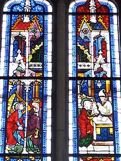 | Stained glass window, ca. 1390 Austrian; From the Schlosskapelle, Ebreichsdorf, AustriaPot-metal and colorless glass with silver stain and vitreous paint Each lancet 11 ft. 8 in. x 12 1/8 in. (357.2 x 30.8 cm) The Cloisters Collection, 1986 (1986.285.1,2) | Eigenes Werk | Gryffindor | Datei:Glasfenster Schlosskapelle Ebreichsdorf 3b.jpg | |