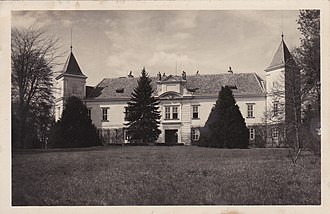 | Hauptfassade von Schloss Fünfkirchen, aufgenommen um 1925 | Scan einer historischen Postkarte auf Privatbesitz | Autor/-in unbekannt Unknown author | Datei:Fassade von Schloss Fünfkirchen, um 1925.jpg | |