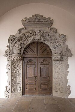 | Gotha, Schloss Friedenstein, Eingang zur Schlosskirche (Spolie der Burg Grimmenstein; Bildhauer Simon Schröter, 1553) | Eigenes Werk | Stefan C. Hoja | Datei:Friedenstein gotha schlosskirche portal.jpg | |