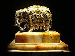 | Hist. Exponat, Schlossmuseum Gotha, Schloss FriedensteinElefant, aus der Werkstatt von Johann Melchior Dinglinger, Dresden, um 1710/20, seit 1728 in der Kunstkammer Gotha nachweisbar. | Eigenes Werk | Peter Schmelzle | Datei:Gotha-exponate-003.jpg | |